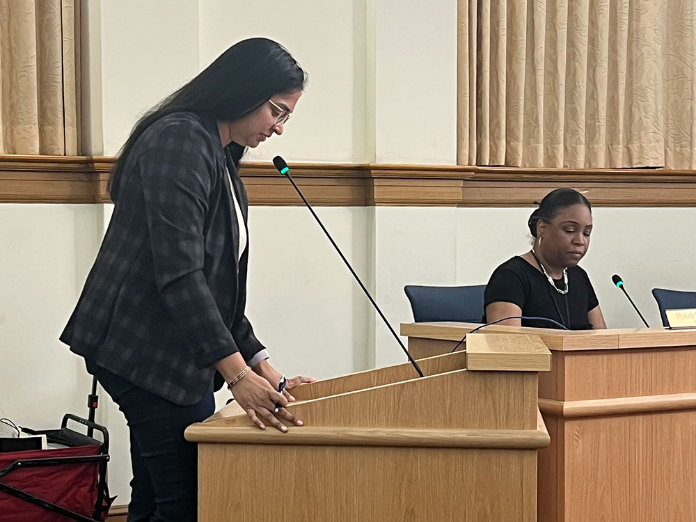 Dr. Rajni Mandal was focusing on raising her two daughters until a shooting on her street in 2024, when she started bringing facts and figures to public forums, like this police meeting of July 12th, see her interview. photo: D. Blair