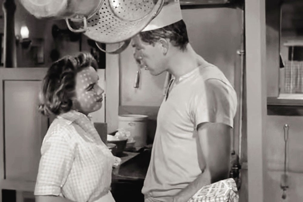 Colander v. Semiotics: In Edward Dein’s 'Shack Out On 101' (1955), Slob (Lee Marvin) stares holes in Kotty's (Terry Moore) visage. photo: courtesy E. Dein