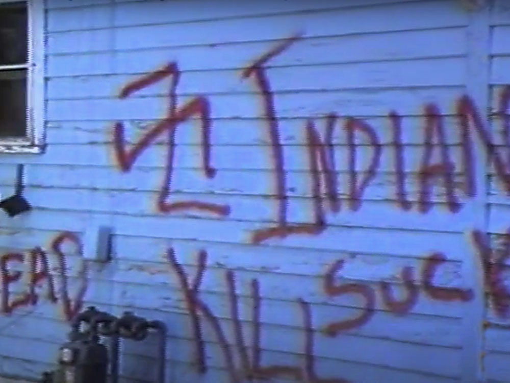 Graffiti on the house of Native American-White couple: Natives were also effected by the racist attacks and were active in protesting against them. image: unknown