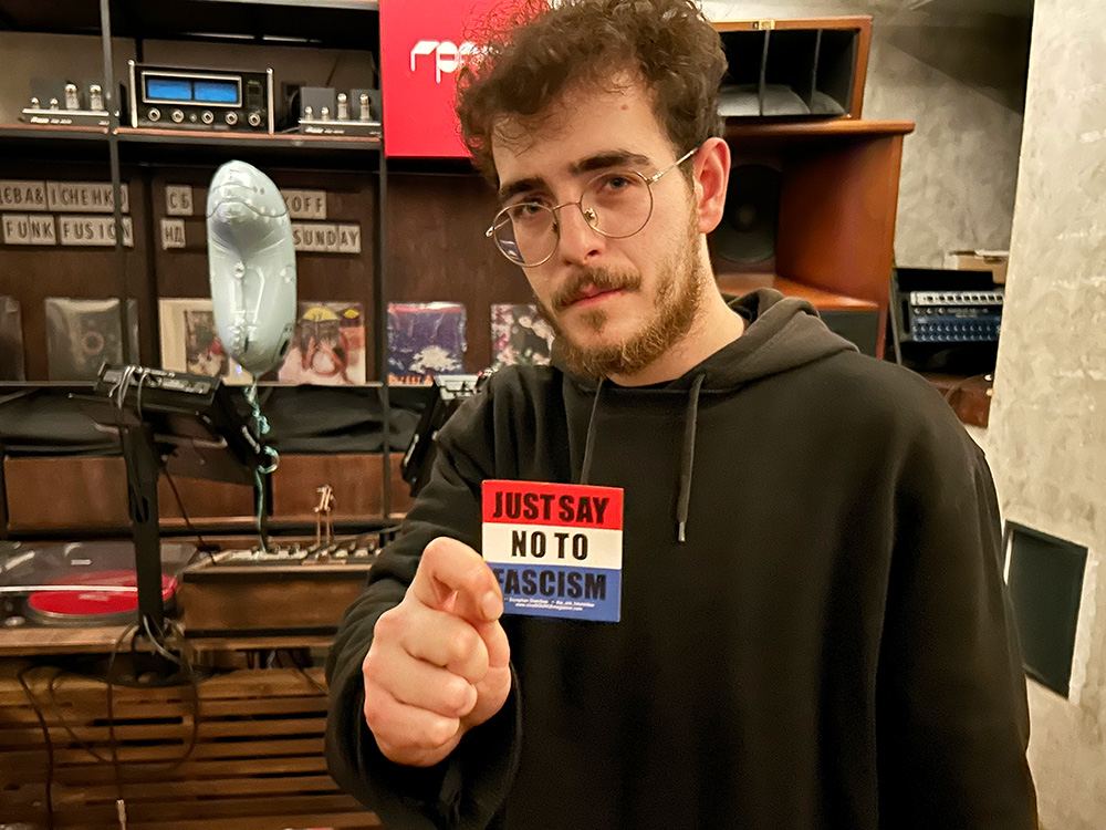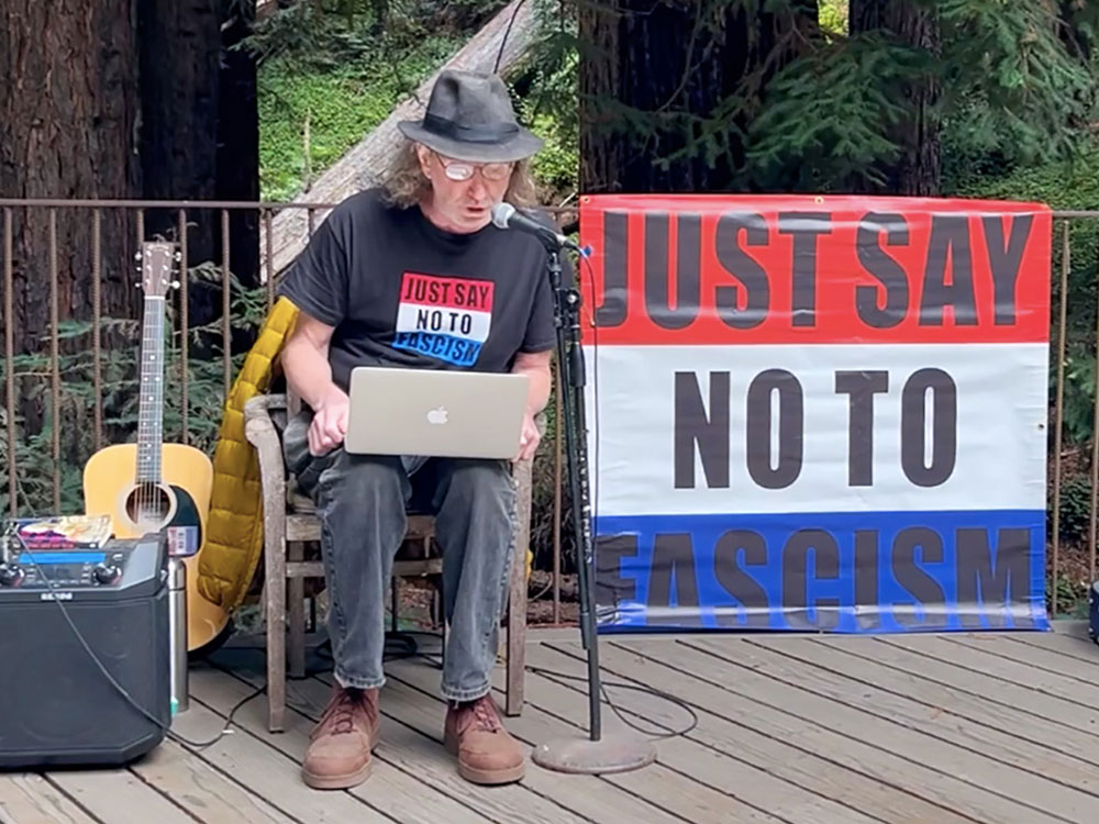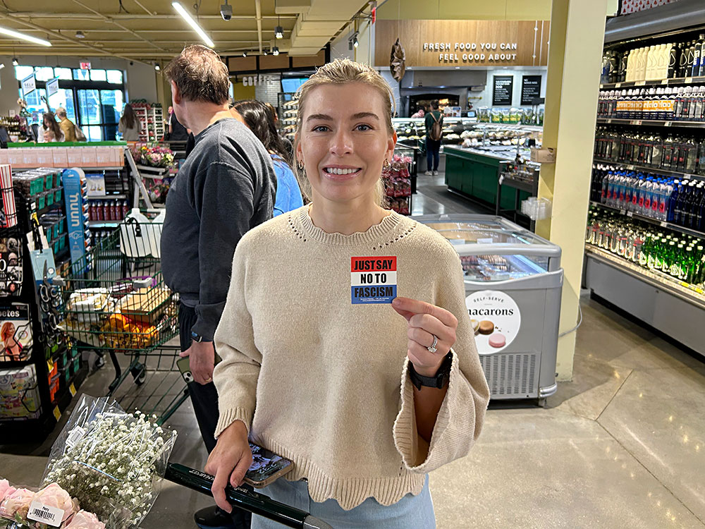 Julie took a JUST SAY NO TO FASCISM sticker in an Austin Whole Foods, where two employees did also but declined to be photographed (12/19/25). photo: D. Blair